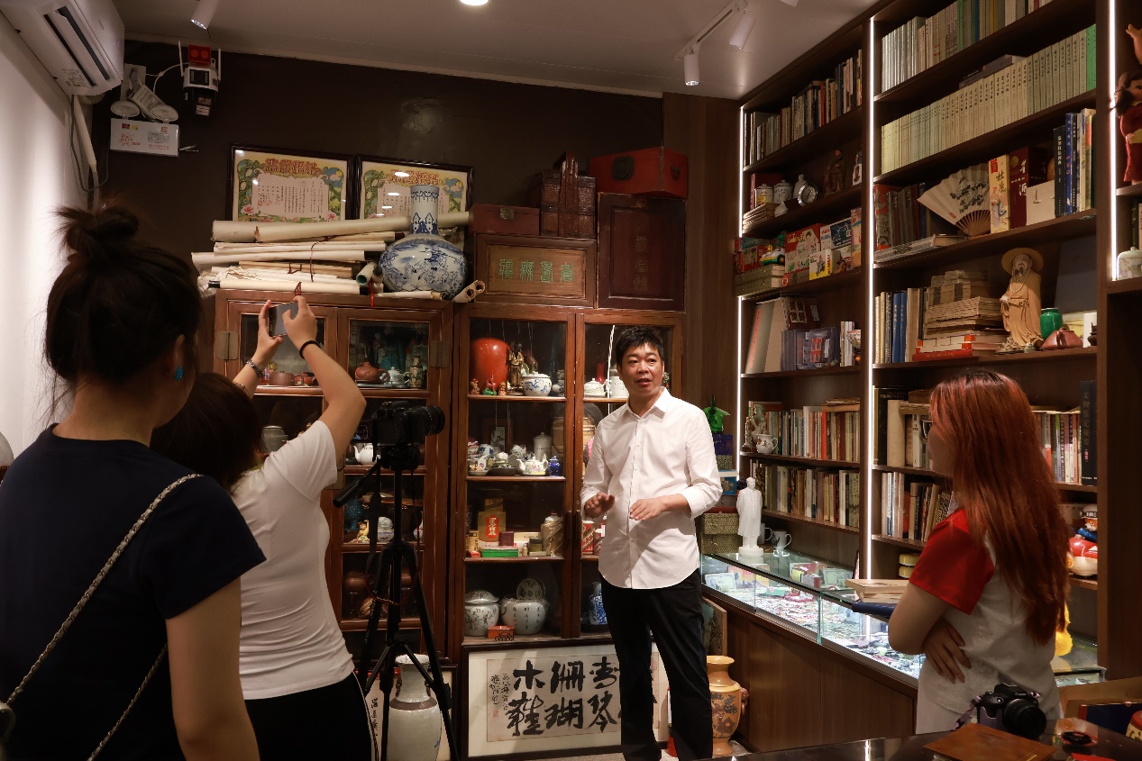 小小的店面被旧物填得满满当当,却能看出是被仔细归置过,旧书在墙根摞出半人高的弧度,玻璃柜里的瓷器在暗处闪烁着的冷光。店面逼仄、物什繁多,很难找到一个画面简洁且光线合适的地方,最终我们还是让他坐在了最熟悉的“柜台”前,他周身的气场才松弛下来。