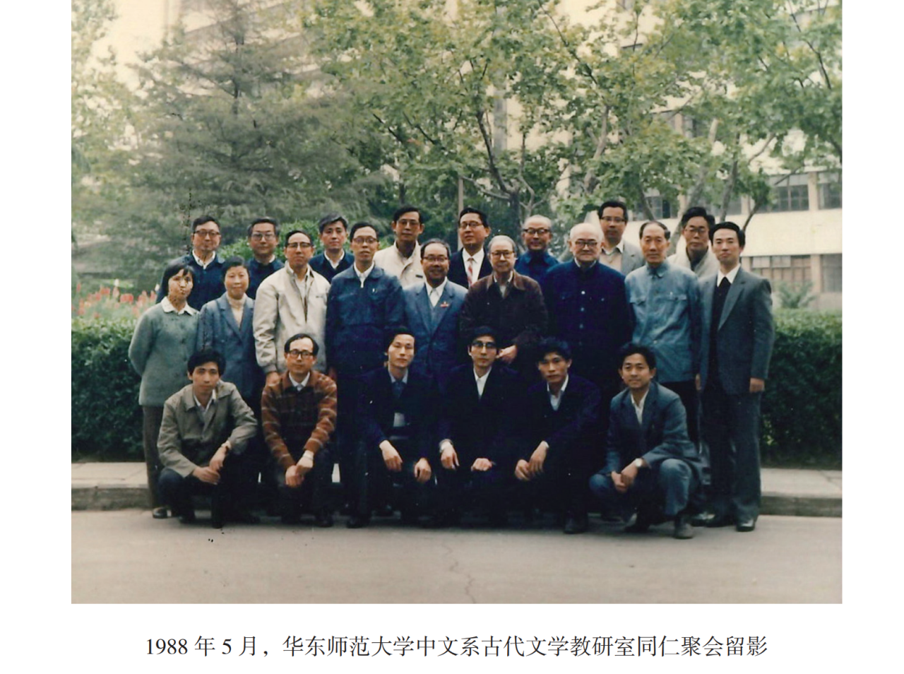 1988 年 5 月,华东师范大学中文系古代文学教研室同事在一起。中间一排左起:陈晓芬、朱碧莲、齐森华、方智范、郭豫适、施蛰存、万云骏、陈谦豫、高建中。