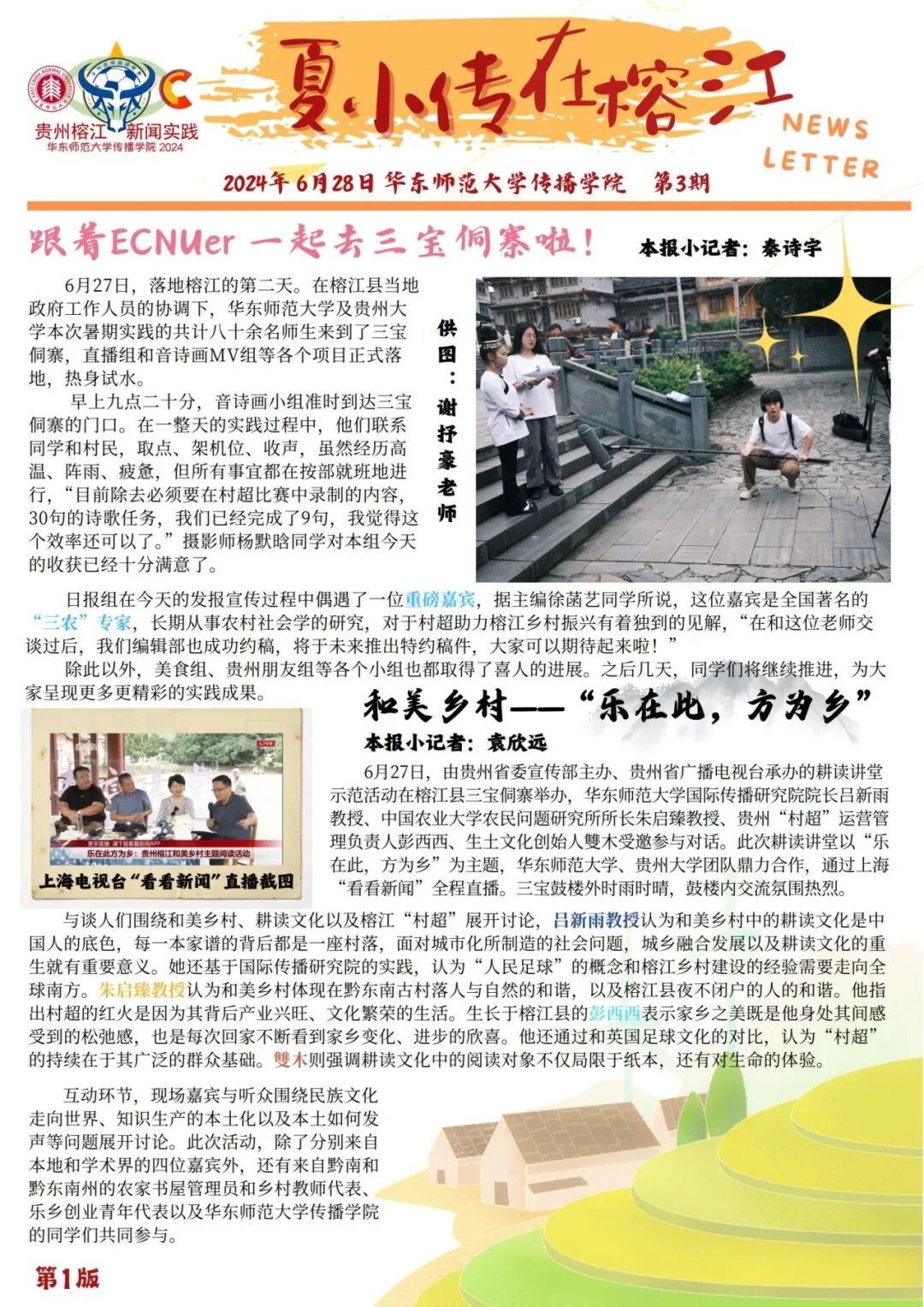 侗寨旁缓缓流淌的都柳江水,送来了连绵密雨中难得的凉风,也送来了一份来自传播学院办报组精心准备的“小礼品”。办报组争分夺秒,已在节奏紧张的行程中编辑印制出两期小报,并带到三宝侗寨分发传阅。“大家都在主动帮我们宣传和分发小报,我们似乎已经扩大了传播途径!”办报组主编辑徐函艺同学很是惊喜,更让她激动的是,小报还受到了当地村民与干部的表扬,让同学们倍感成就。