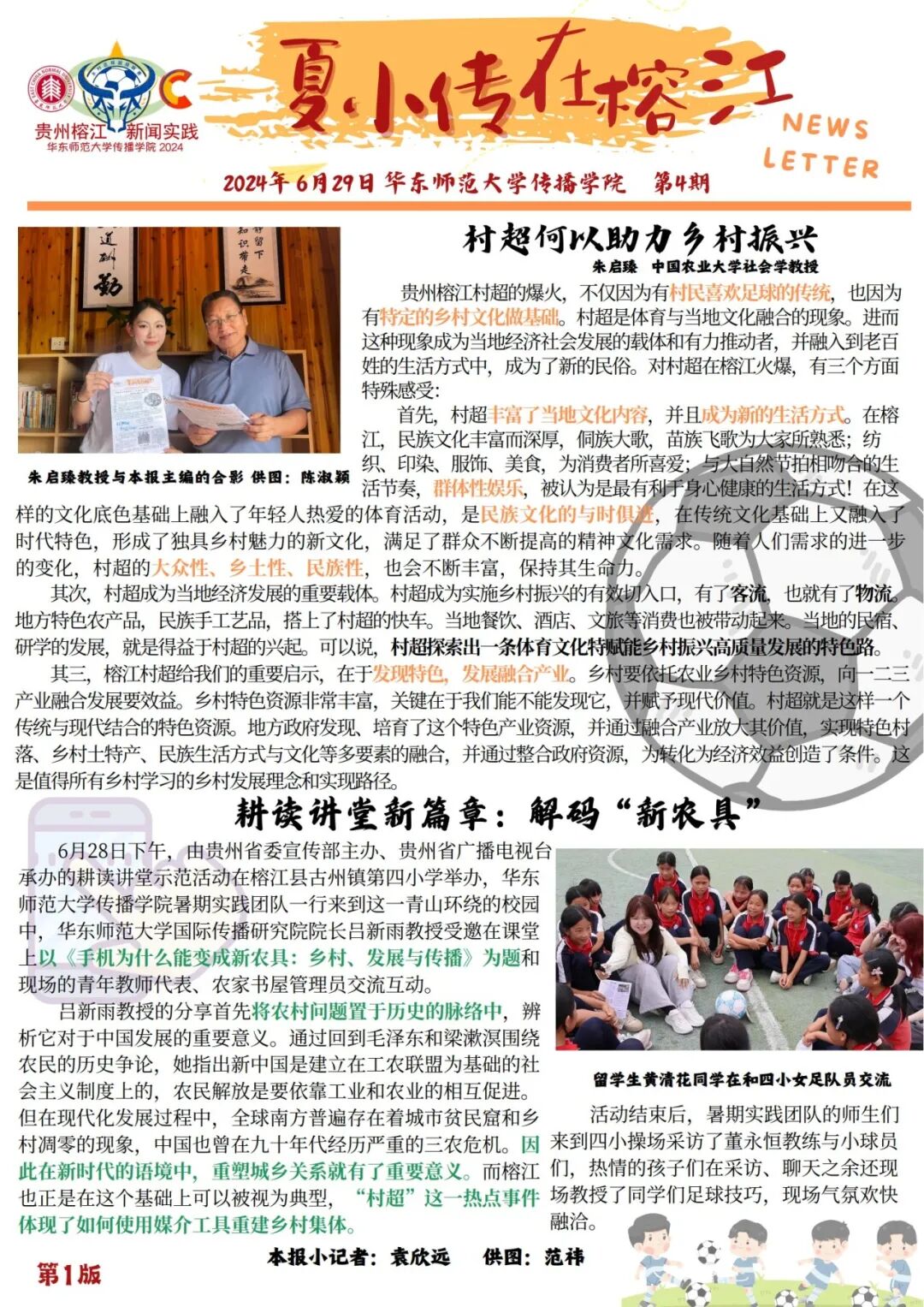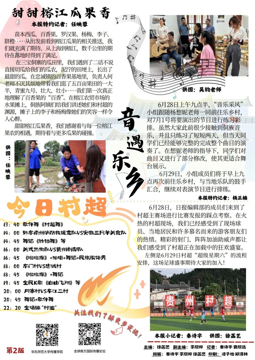 从侗寨街巷到村超球场,总能看见一页亮眼的橙色报头,暑期新闻实践操办的日报《夏小传在榕江》的读者,也从出行前的学院同学,逐渐扩大到各行各业的榕江人民。6月29日晚,“办报组”将带上制作精美的日报作品,走上“超级星期六”的比赛现场,向榕江人民和远道而来的游客展示传播学院暑期新闻实践团队的丰富成果。
