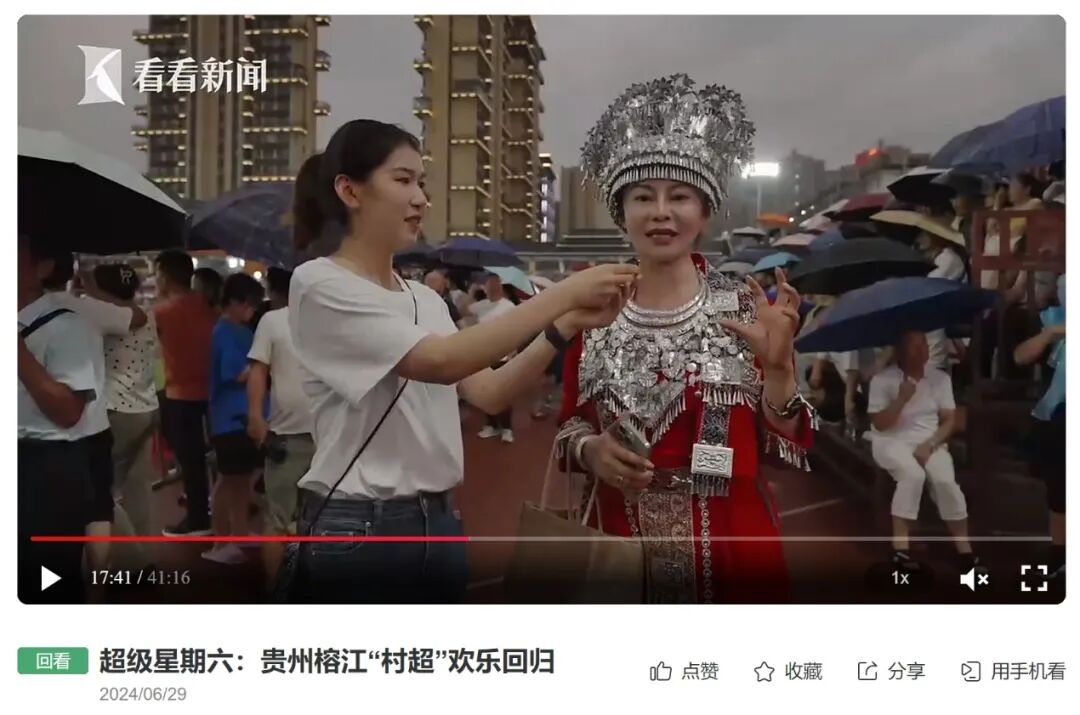 6月29日榕江“村超”的“超级星期六”入场巡游环节中,传播学院师生组成的巡游方阵获得了贵州当地媒体与自媒体的关注。当解说主持人在看台上喊出“华东师范大学传播学院团队方阵”的名称时,“村超”方面官方认证的“贵州村超推荐官”优秀自媒体博主们,纷纷与传院师生互动交谈,将镜头对准方阵中展示的实践成果。传播学院师生的方阵巡游,也登上新华通讯社音视频新闻统计部“秀我中国”、贵州村超纪实等媒体直播画面。