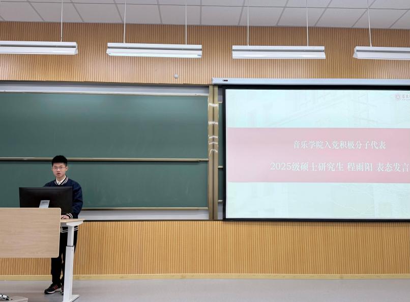 音乐学院2025级硕士研究生程雨阳作为本期学员代表进行表态发言。他结合自身专业学习、艺术实践和参加“华东师范大学第26届研究生支教团”的经历,深刻感悟新时代文艺青年的责任与使命,进一步端正了入党动机,坚定了向党组织靠拢的理想追求。