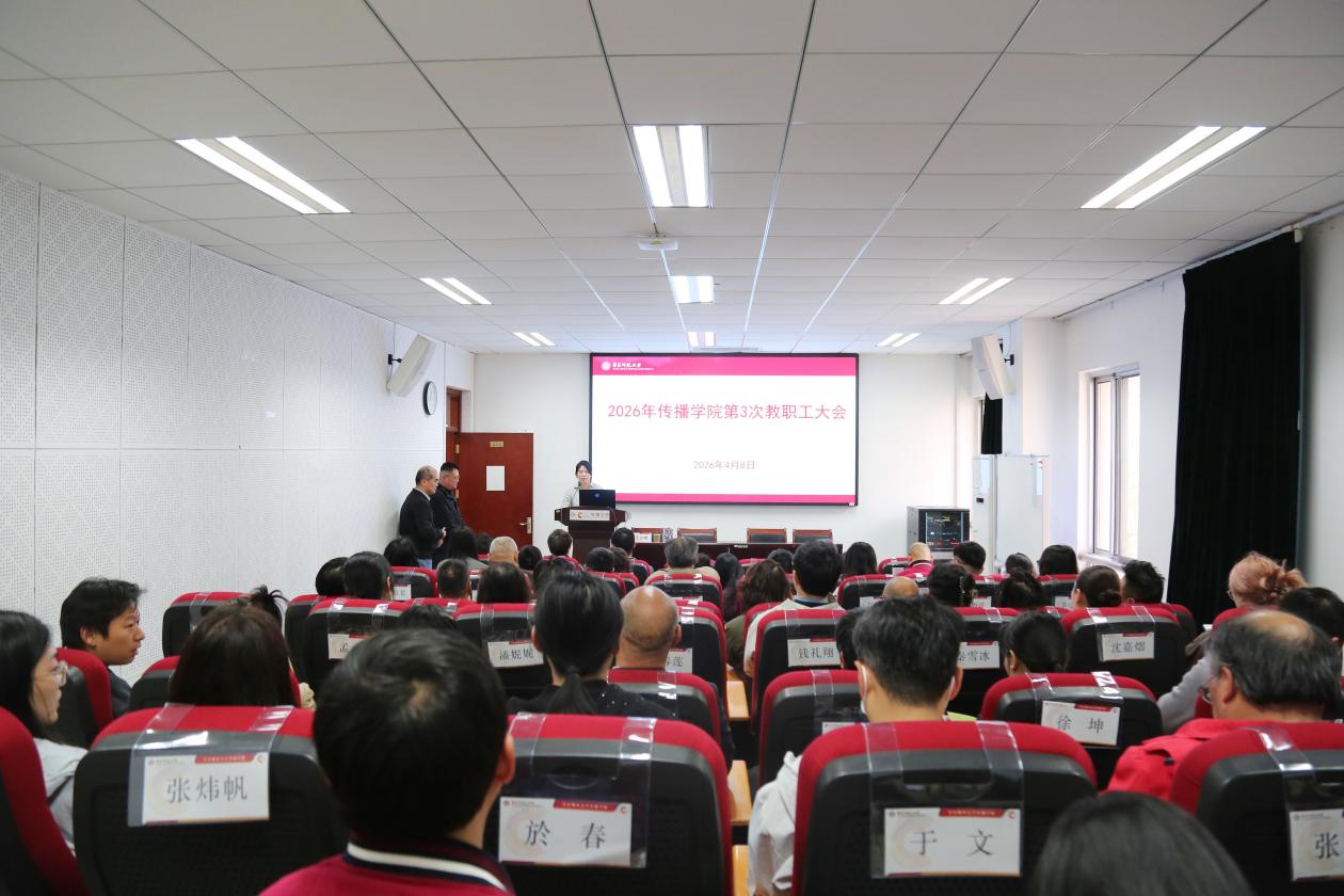 4月8日下午,传播学院在学院212报告厅召开2026年第3次全院教职工大会。传播学院全体教职工参加会议。会议由党委书记朱文佳主持。