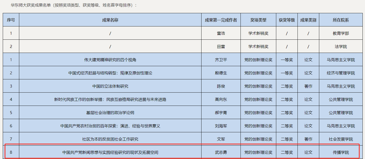 近日,上海市第十六届哲学社会科学优秀成果奖获奖名单公布,我院武志勇教授的论文成果《中国共产党新闻思想与实践经验研究的现状及拓展空间》荣获党的创新理论奖二等奖。