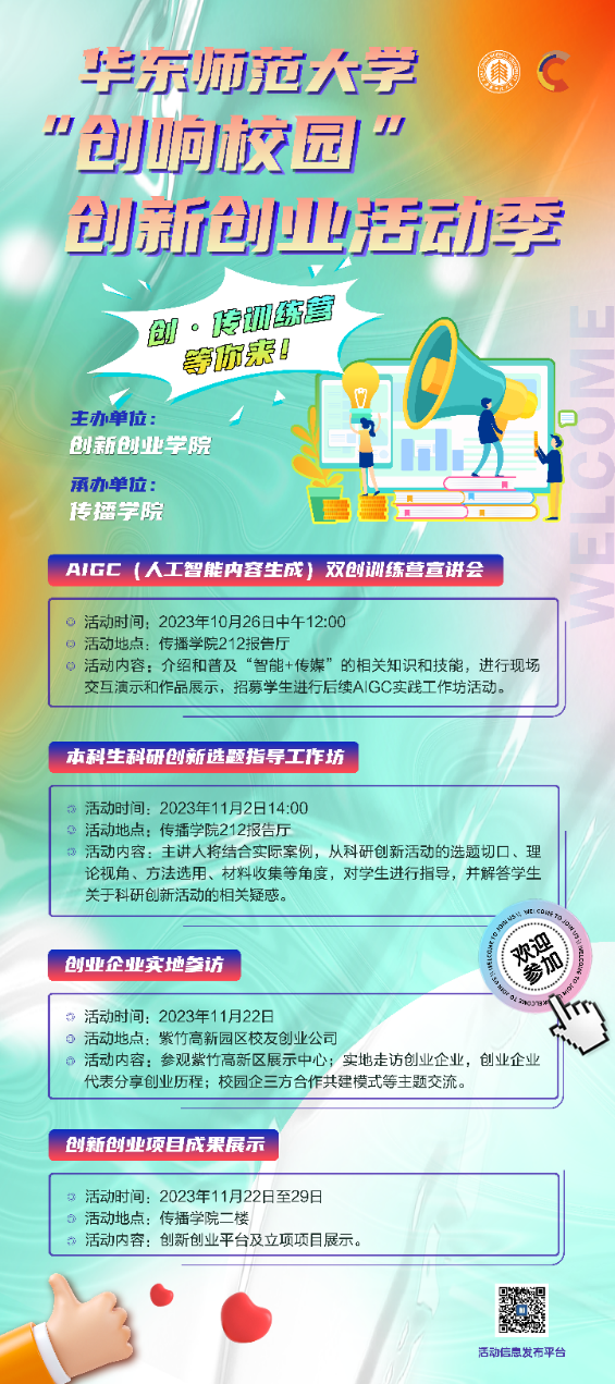 根据《关于开展2023年ECNU“创响校园”创新创业活动季征集工作的通知》,传播学院创.传训练营成功获批立项。10月-11月,传播学院通过知识讲座、团体辅导、走访参观、路演实践等多种形式,启发传院学子们的创业思路,培育创新精神,培养创业思维。活动有序开展,参与学生达300余人,效果显著。